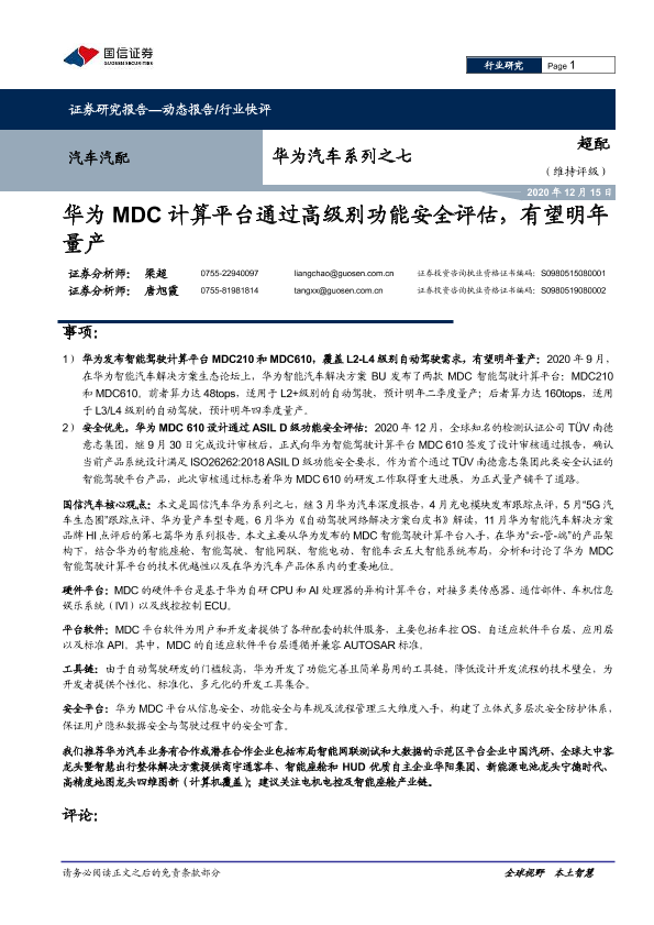 【国信证券】【20201215】华为汽车系列之七:华为MDC计算平台通过高级别功能安全评估,有望明年量产-13页