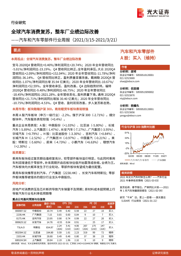 【光大证券】【20210321】汽车和汽车零部件行业周报:全球汽车消费复苏,整车厂业绩边际改善-28页