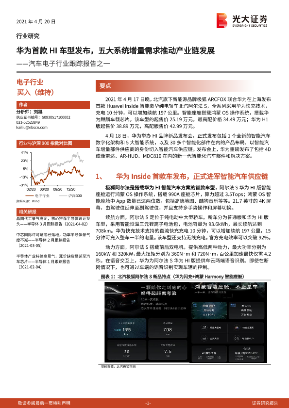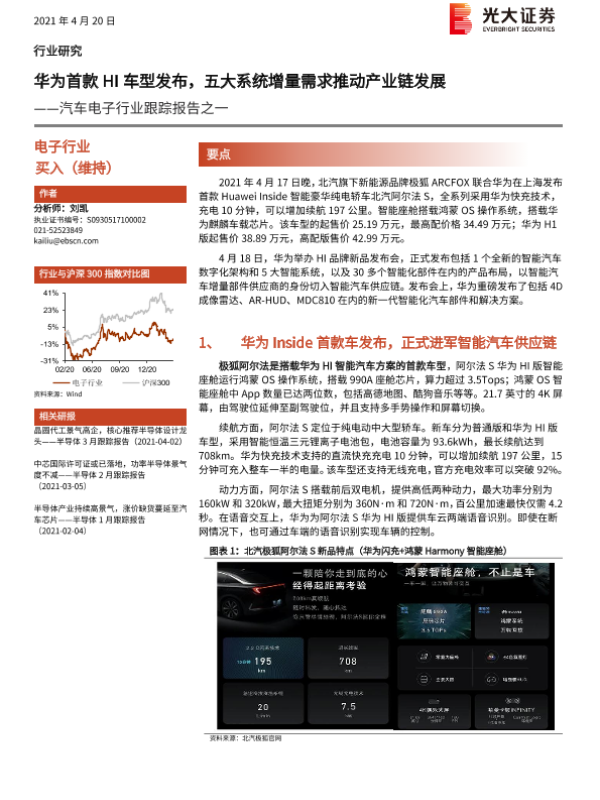 【光大证券】【20210420】20210420-光大证券-汽车电子行业跟踪报告之一:华为首款HI车型发布,五大系统增量需求推动产业链发展-8页