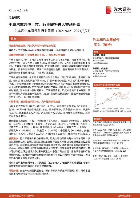【光大证券】【20210628】汽车和汽车零部件行业周报:小鹏汽车赴港上市,行业即将进入被动补库-24页