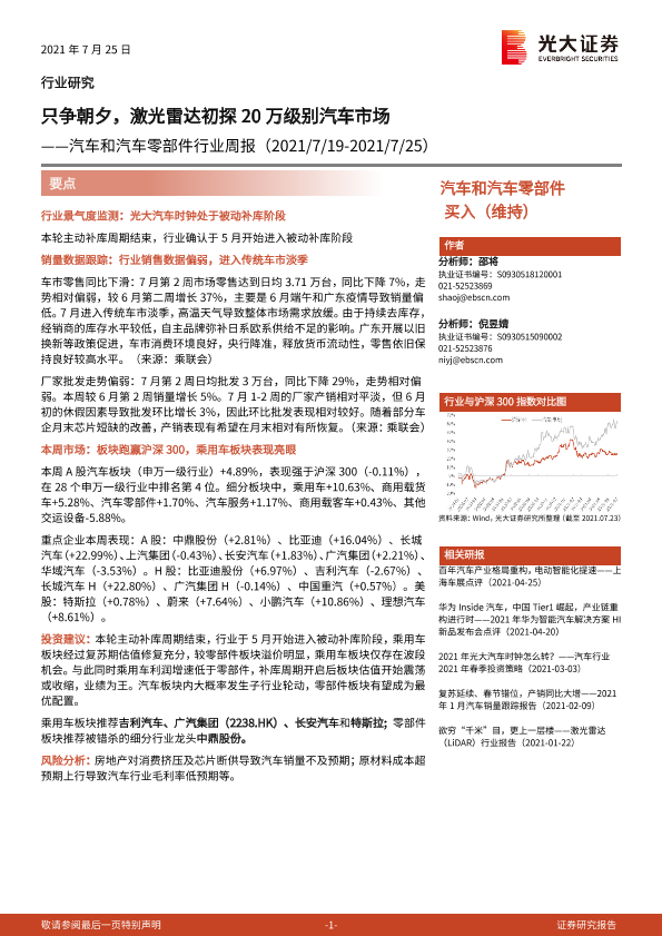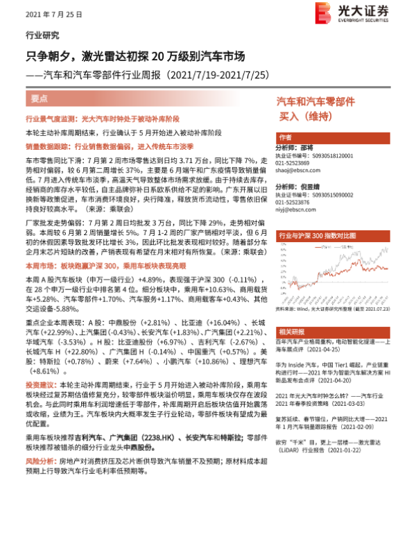 【光大证券】【20210725】汽车和汽车零部件行业周报:只争朝夕,激光雷达初探20万级别汽车市场-19页