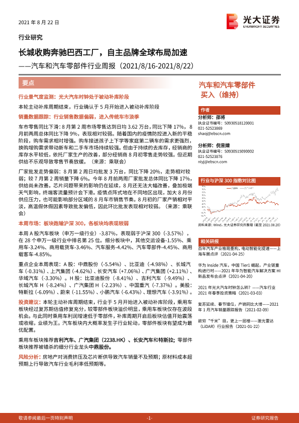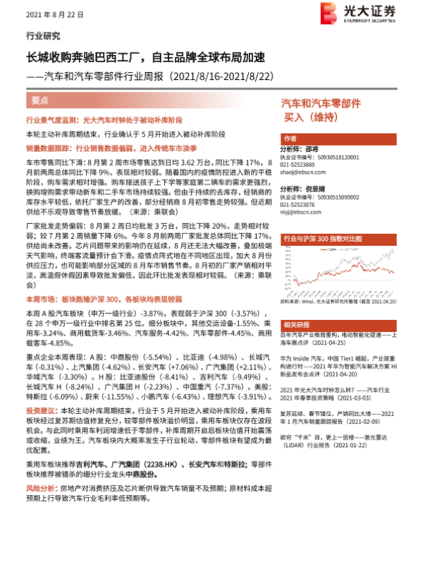 【光大证券】【20210822】汽车和汽车零部件行业周报:长城收购奔驰巴西工厂,自主品牌全球布局加速-22页