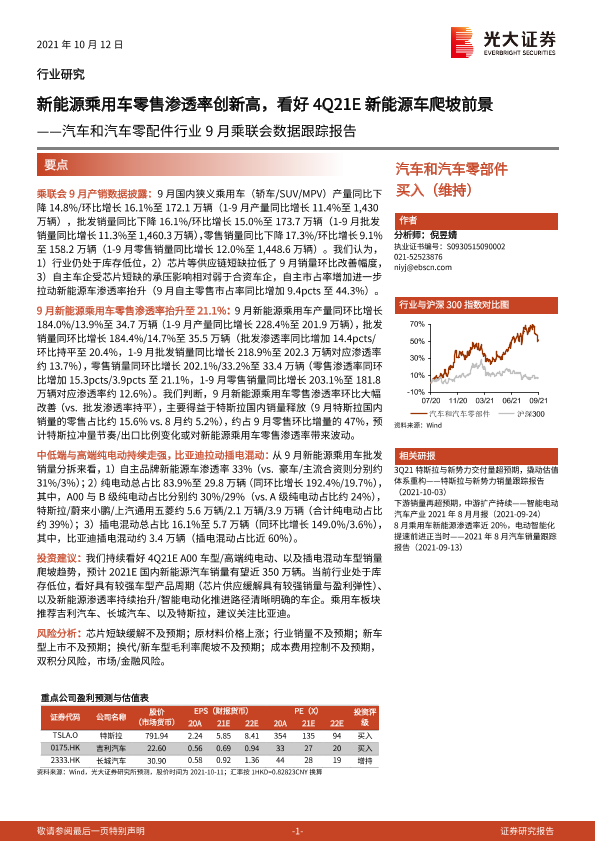 【光大证券】【20211012】汽车和汽车零配件行业9月乘联会数据跟踪报告:新能源乘用车零售渗透率创新高,看好4Q21E新能源车爬坡前景-2页
