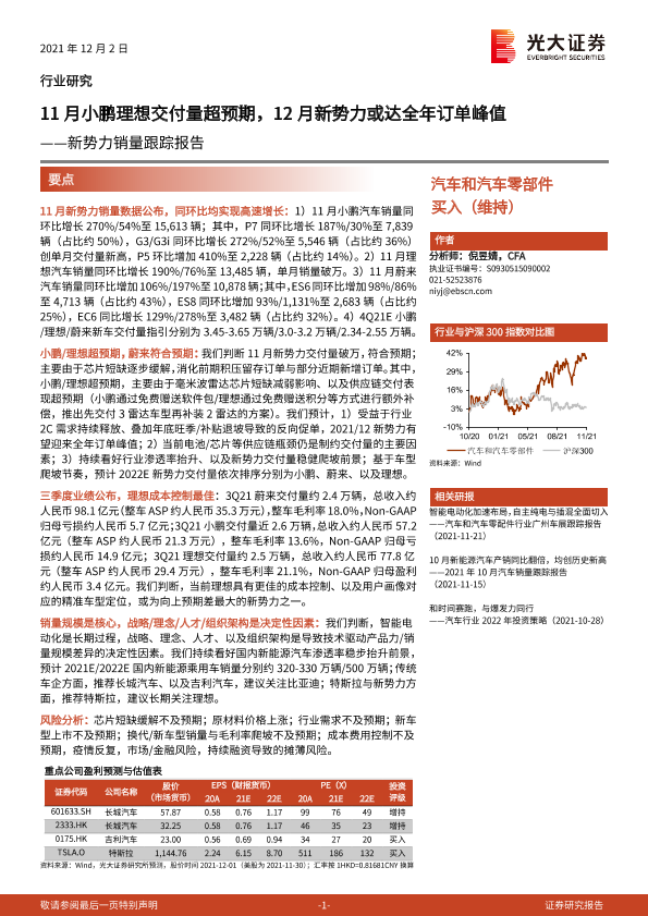 【光大证券】【20211202】汽车和汽车零部件行业研究:新势力销量跟踪报告:11月小鹏理想交付量超预期,12月新势力或达全年订单峰值-3页