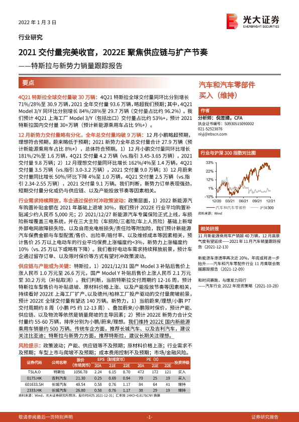 【光大证券】【20220103】2022交付量完美收官,2022E聚焦供应链与扩产节奏——特斯拉与新势力销量跟踪报告-4页