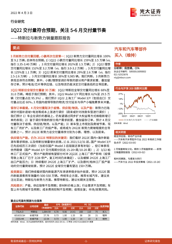【光大证券】【20220403】特斯拉与新势力销量跟踪报告:1Q22交付量符合预期,关注5-6月交付量节奏-4页