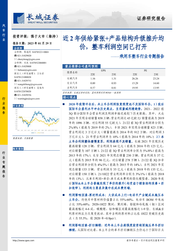 【长城证券】【20230129】乘用车整车行业专题报告:近2年供给紧张+产品结构升级推升均价,整车利润空间已打开-31页