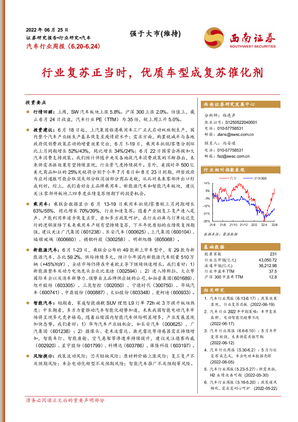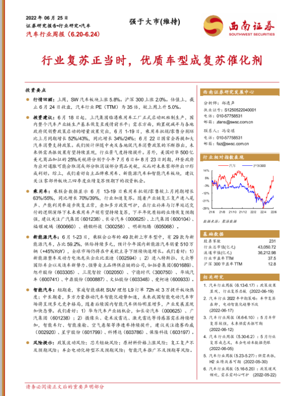 【西南证券】【20220625】汽车行业周报:行业复苏正当时,优质车型成复苏催化剂-18页