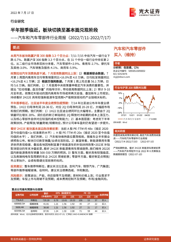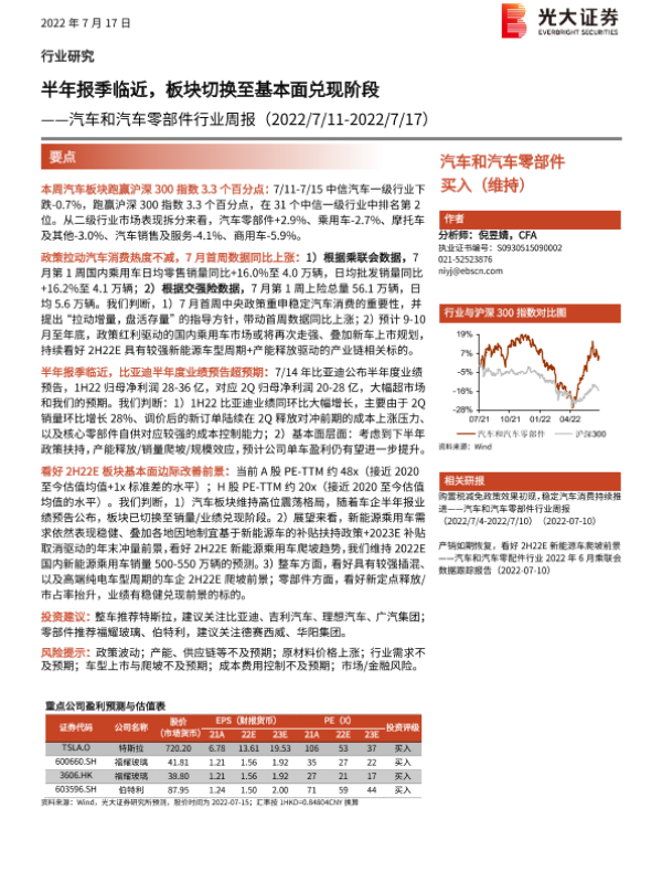 【光大证券】【20220717】汽车和汽车零部件行业周报:半年报季临近,板块切换至基本面兑现阶段-16页