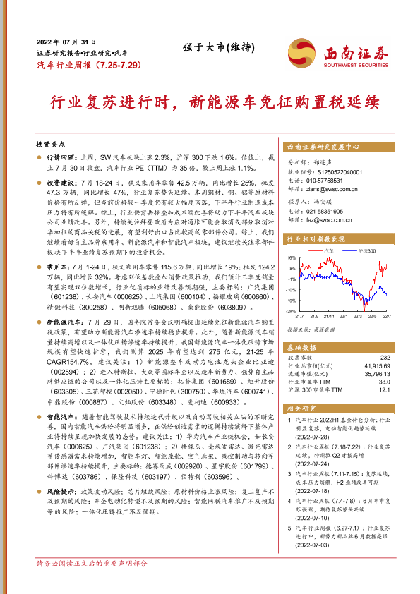 【西南证券】【20220731】汽车行业周报:行业复苏进行时,新能源车免征购置税延续-16页