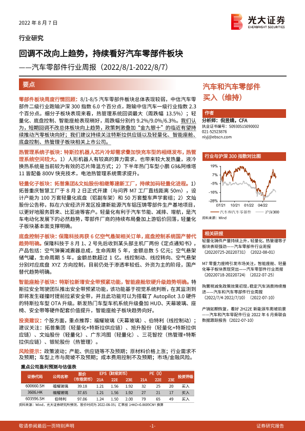 【光大证券】【20220807】20220807-光大证券-汽车零部件行业周报:回调不改向上趋势,持续看好汽车零部件板块-18页