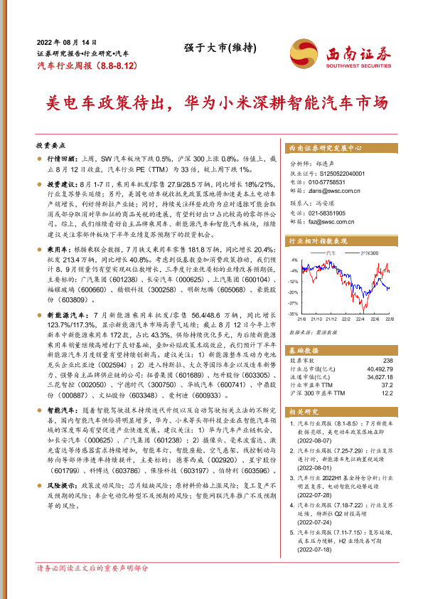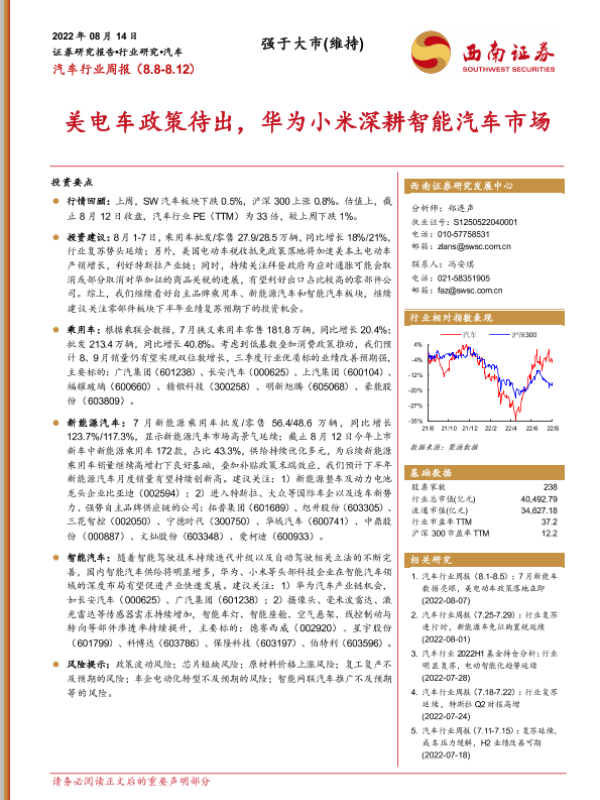 【西南证券】【20220814】20220814-西南证券-汽车行业周报:美电车政策待出,华为小米深耕智能汽车市场-18页