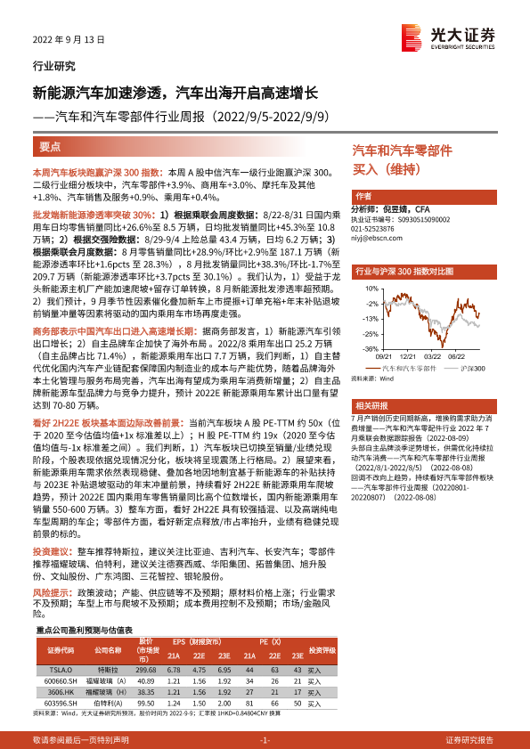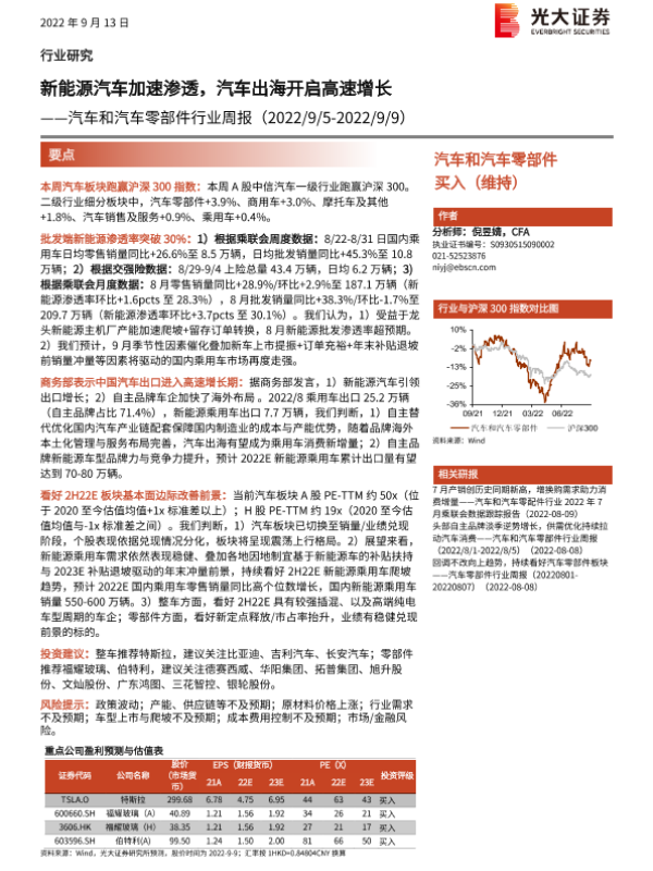 【光大证券】【20220913】汽车和汽车零部件行业周报:新能源汽车加速渗透,汽车出海开启高速增长-22页