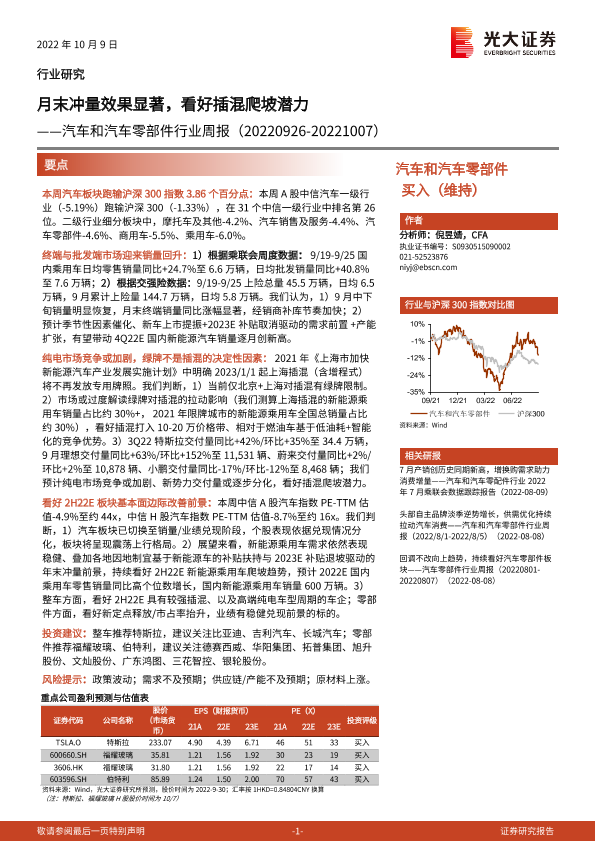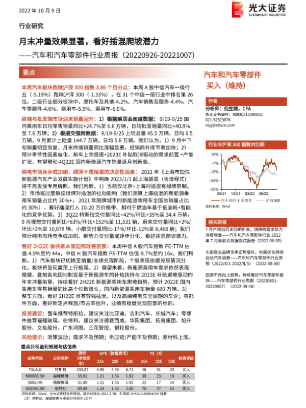 【光大证券】【20221009】汽车和汽车零部件行业周报:月末冲量效果显著,看好插混爬坡潜力-25页