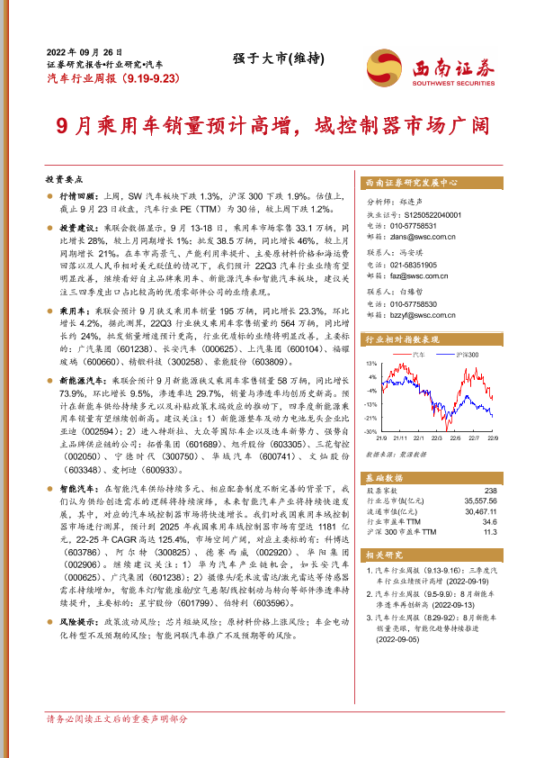 【西南证券】【20220926】20220926-西南证券-汽车行业周报:9月乘用车销量预计高增,域控制器市场广阔-17页