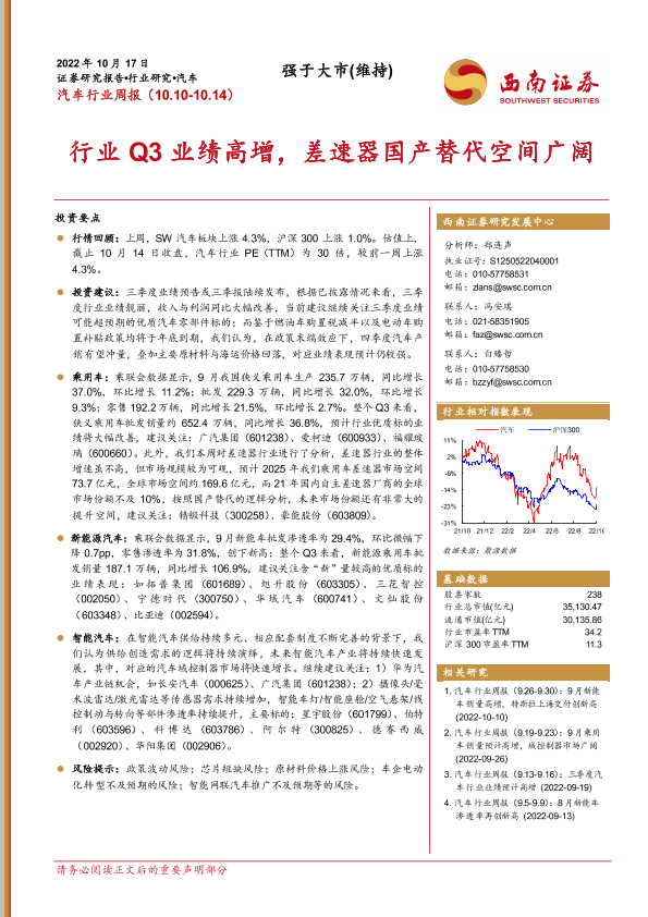 【西南证券】【20221017】汽车行业周报:行业Q3业绩高增,差速器国产替代空间广阔-19页