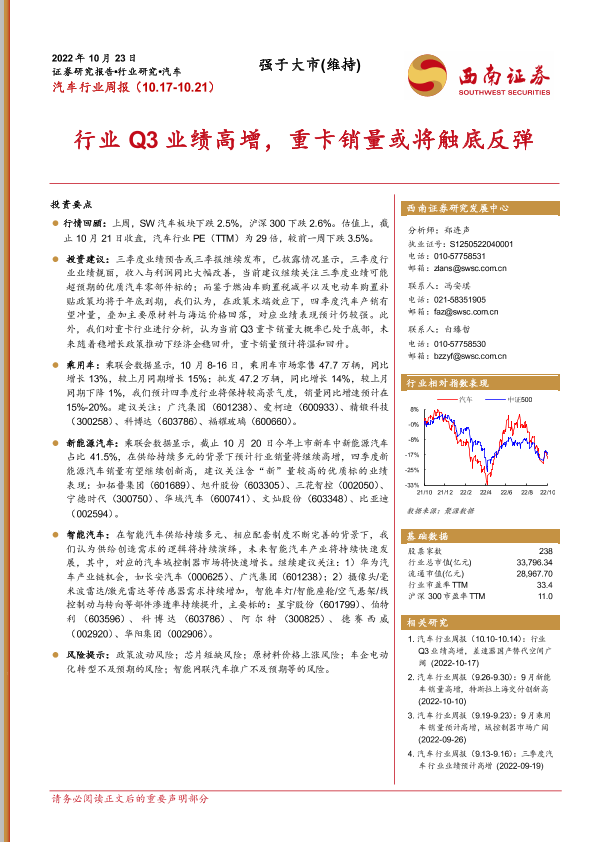 【西南证券】【20221023】汽车行业周报:行业Q3业绩高增,重卡销量或将触底反弹-19页