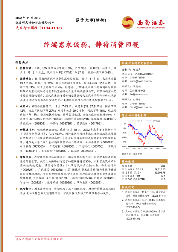 【西南证券】【20221120】汽车行业周报:终端需求偏弱,静待消费回暖-14页