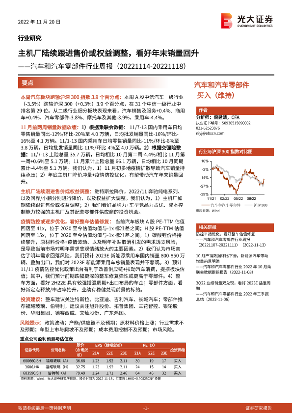 【光大证券】【20221120】汽车和汽车零部件行业周报:主机厂陆续跟进售价或权益调整,看好年末销量回升-21页