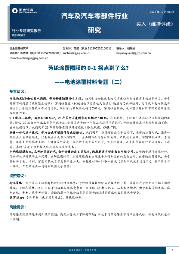 【国金证券】【20221206】汽车及汽车零部件行业研究:电池涂覆材料专题(二)-芳纶涂覆隔膜的0-1拐点到了么?-17页