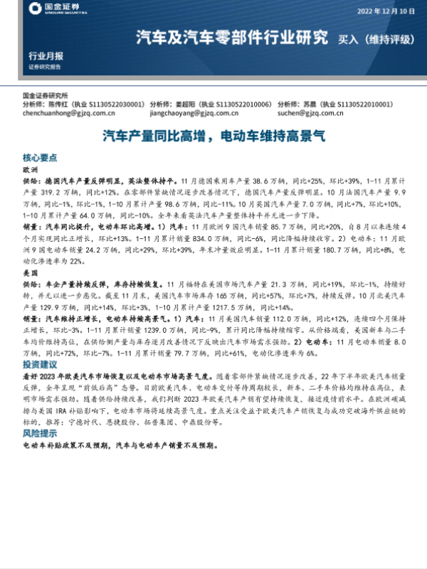 【国金证券】【20221210】汽车及汽车零部件行业研究:汽车产量同比高增,电动车维持高景气-11页