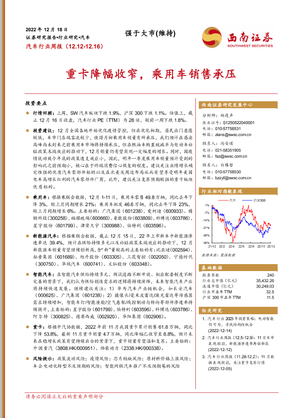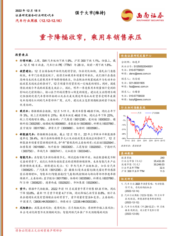 【西南证券】【20221218】20221218-西南证券-汽车行业周报:重卡降幅收窄,乘用车销售承压-14页
