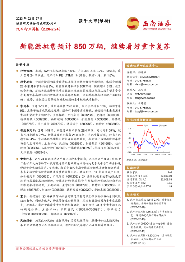 【西南证券】【20230227】20230227-西南证券-汽车行业周报:新能源批售预计850万辆,继续看好重卡复苏-22页