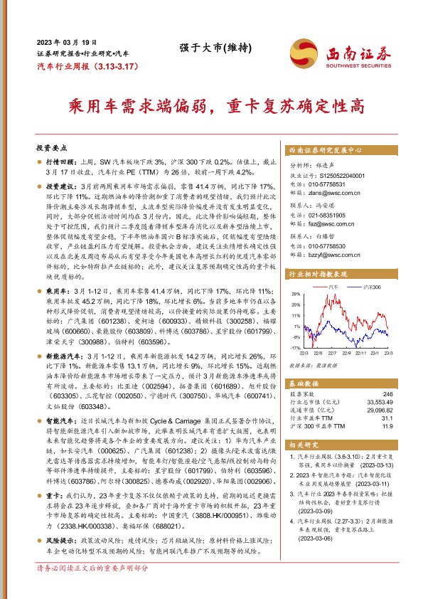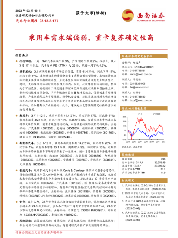 【西南证券】【20230319】20230319-西南证券-汽车行业周报:乘用车需求端偏弱,重卡复苏确定性高-24页