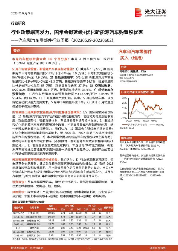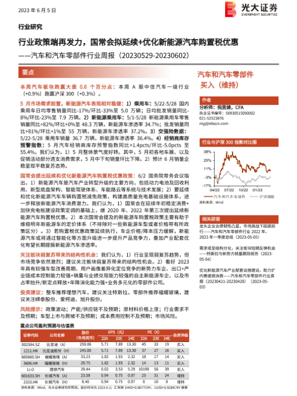 【光大证券】【20230605】汽车和汽车零部件行业周报:行业政策端再发力,国常会拟延续+优化新能源汽车购置税优惠-25页