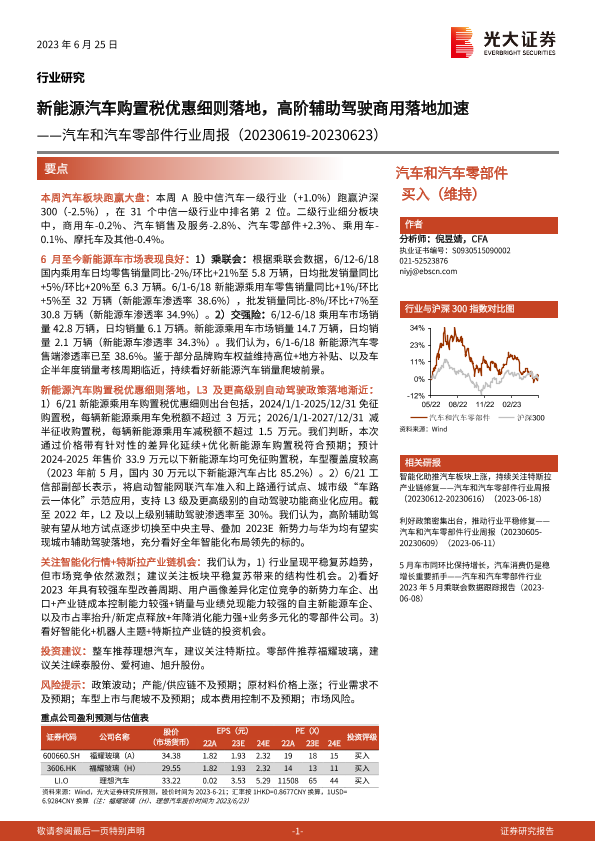 【光大证券】【20230625】汽车和汽车零部件行业周报:新能源汽车购置税优惠细则落地,高阶辅助驾驶商用落地加速-23页