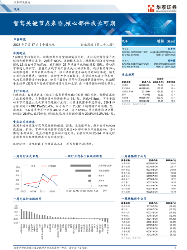 【华泰证券】【20230717】汽车行业周报(第二十八周):智驾关键节点来临,核心部件成长可期-24页
