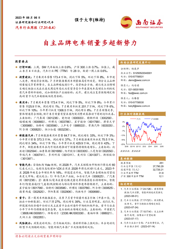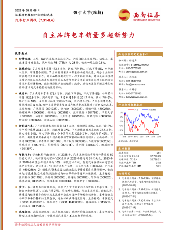 【西南证券】【20230806】汽车行业周报:自主品牌电车销量多超新势力-16页