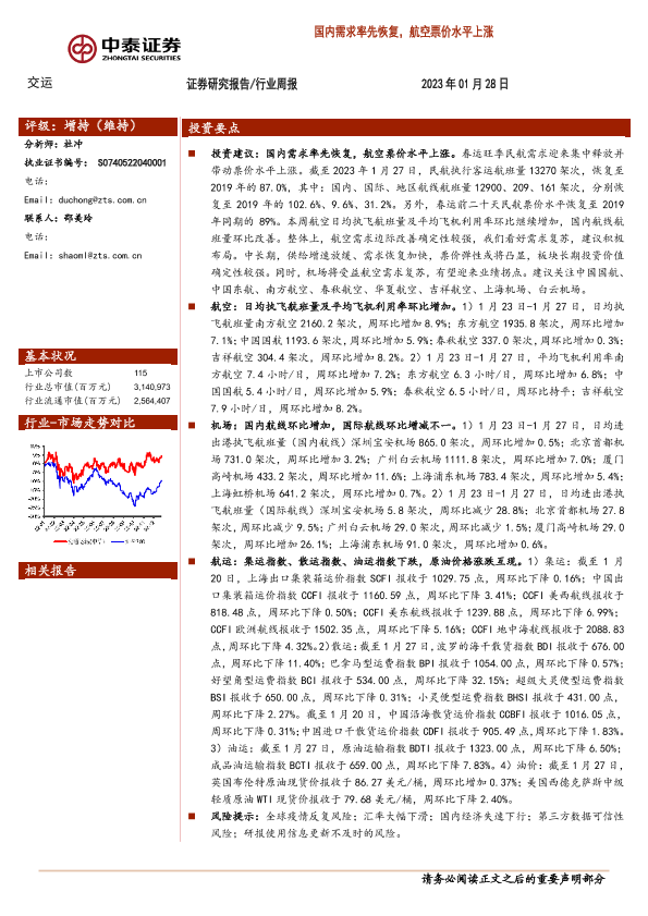 【中泰证券】【20230128】交运行业周报:国内需求率先恢复,航空票价水平上涨-36页