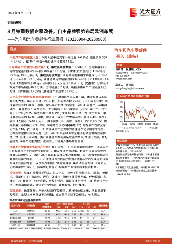 【光大证券】【20230910】汽车和汽车零部件行业周报:8月销量数据企稳改善,自主品牌强势布局欧洲车展-22页