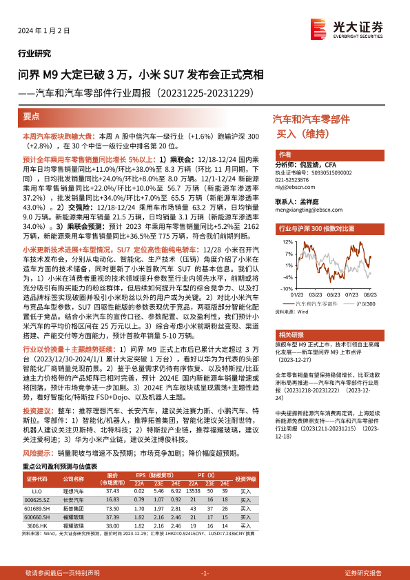 【光大证券】【20240102】汽车和汽车零部件行业周报:问界M9大定已破3万,小米SU7发布会正式亮相-27页