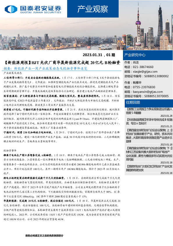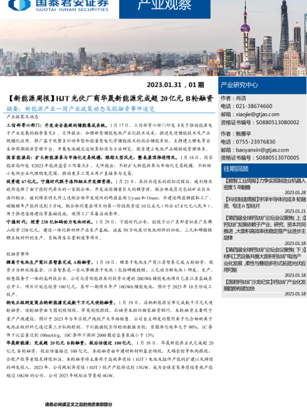 【国泰君安证券】【20230131】产业观察01期:【新能源周报】HJT光伏厂商华晟新能源完成超20亿元B轮融资-16页