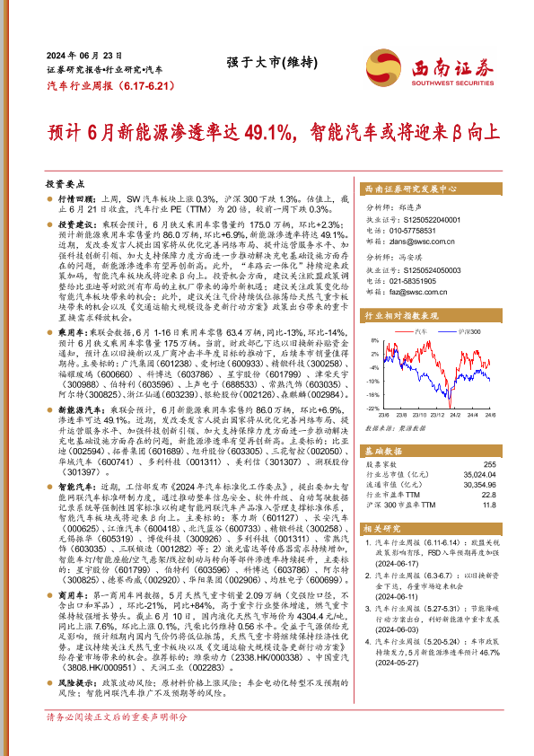 【西南证券】【20240623】20240623-西南证券-汽车行业周报:预计6月新能源渗透率达49.1%,智能汽车或将迎来β向上-19页