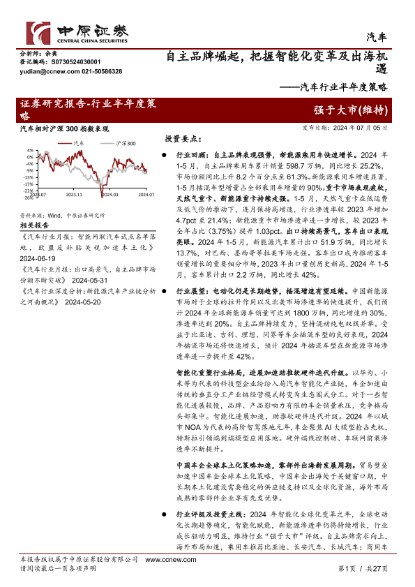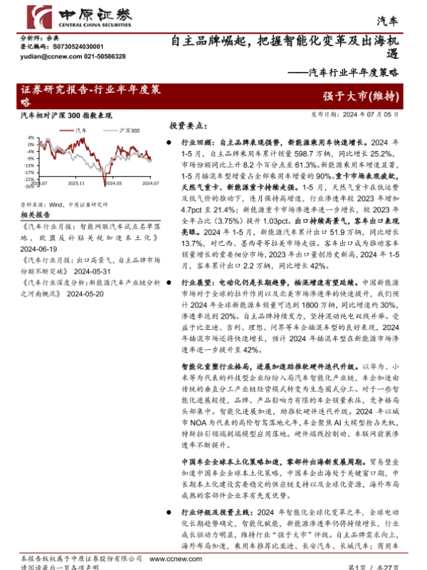 【中原证券】【20240705】20240705-中原证券-汽车行业半年度策略:自主品牌崛起,把握智能化变革及出海机遇-27页