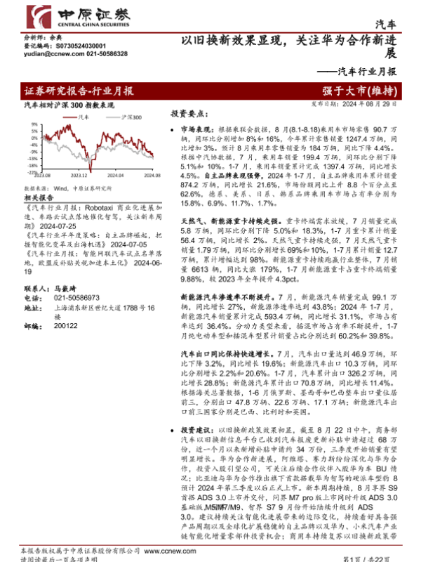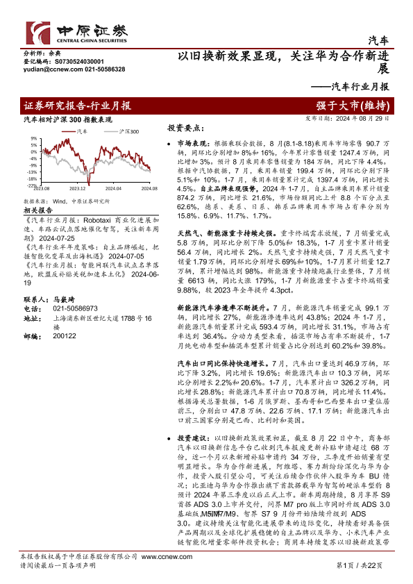 【中原证券】【20240829】20240829-中原证券-汽车行业月报:以旧换新效果显现,关注华为合作新进展-22页
