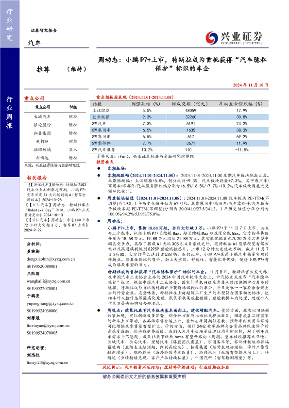 【兴业证券】【20241110】20241110-兴业证券-汽车周动态:小鹏P7+上市,特斯拉成为首批获得“汽车隐私保护”标识的车企-12页