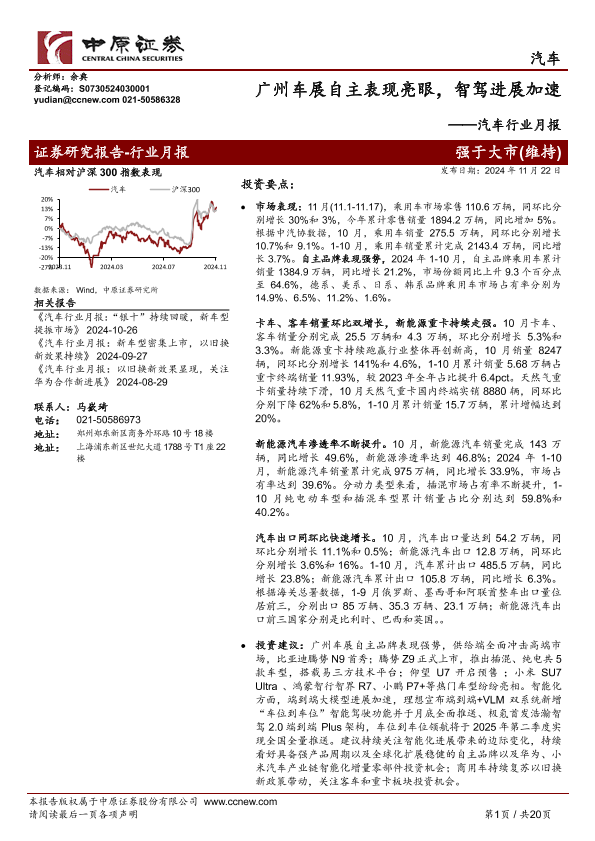 【中原证券】【20241122】20241122-中原证券-汽车行业月报:广州车展自主表现亮眼,智驾进展加速-20页