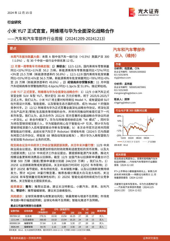 【光大证券】【20241215】汽车和汽车零部件行业周报:小米YU7正式官宣,阿维塔与华为全面深化战略合作-39页