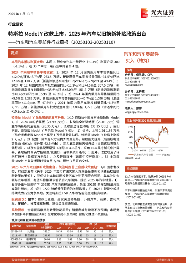 【光大证券】【20250113】汽车和汽车零部件行业周报:特斯拉Model Y改款上市,2025年汽车以旧换新补贴政策出台-26页