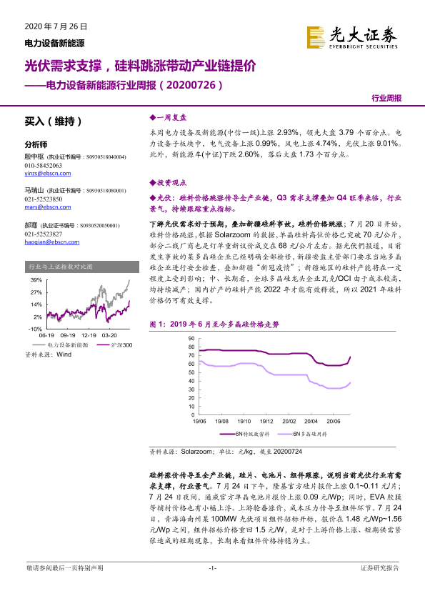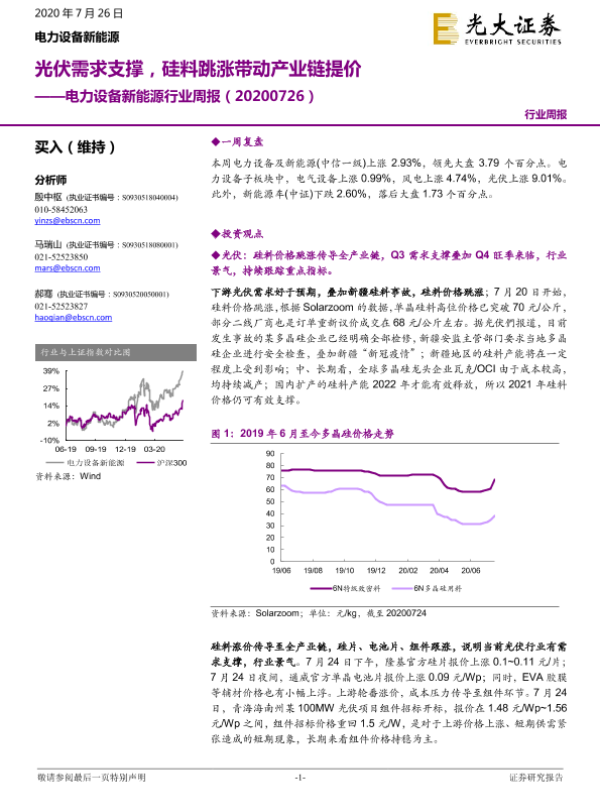 【光大证券】【20200726】电力设备新能源行业周报:光伏需求支撑,硅料跳涨带动产业链提价-30页