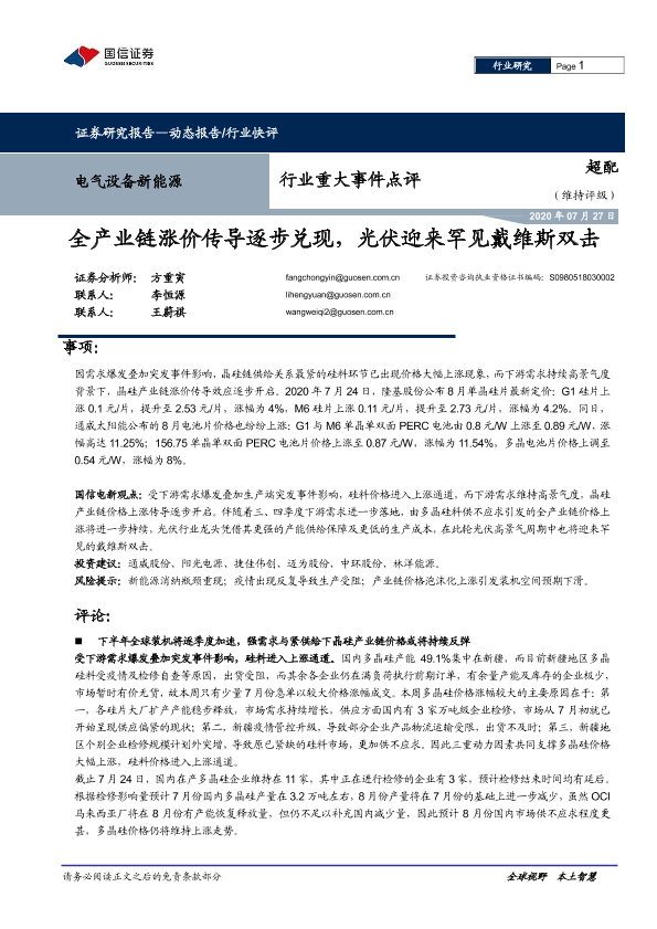 【国信证券】【20200727】电气设备新能源行业重大事件点评:全产业链涨价传导逐步兑现,光伏迎来罕见戴维斯双击-7页