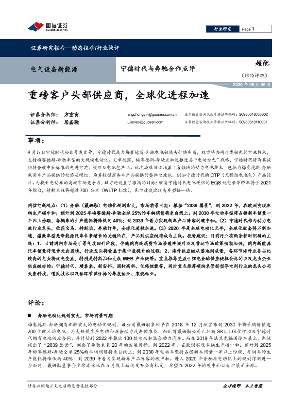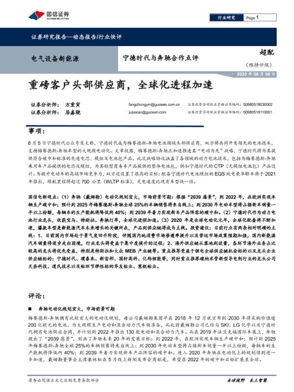 【国信证券】【20200806】电气设备新能源:宁德时代与奔驰合作点评:重磅客户头部供应商,全球化进程加速-6页