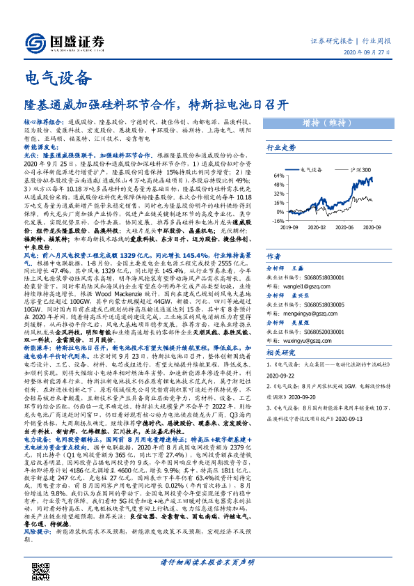 【国盛证券】【20200927】电气设备行业周报:隆基通威加强硅料环节合作,特斯拉电池日召开-15页