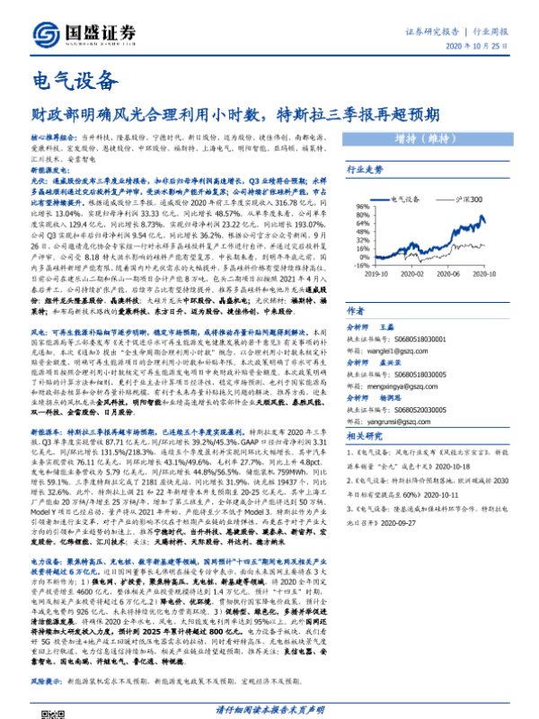 【国盛证券】【20201025】电气设备行业周报:财政部明确风光合理利用小时数,特斯拉三季报再超预期-16页