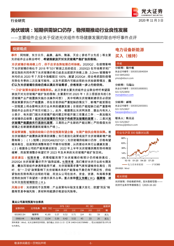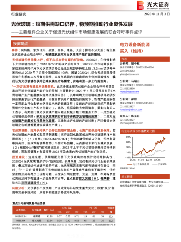 【光大证券】【20201103】电力设备新能源:主要组件企业关于促进光伏组件市场健康发展的联合呼吁事件点评-光伏玻璃:短期供需缺口仍存,稳预期推动行业良性发展-2页