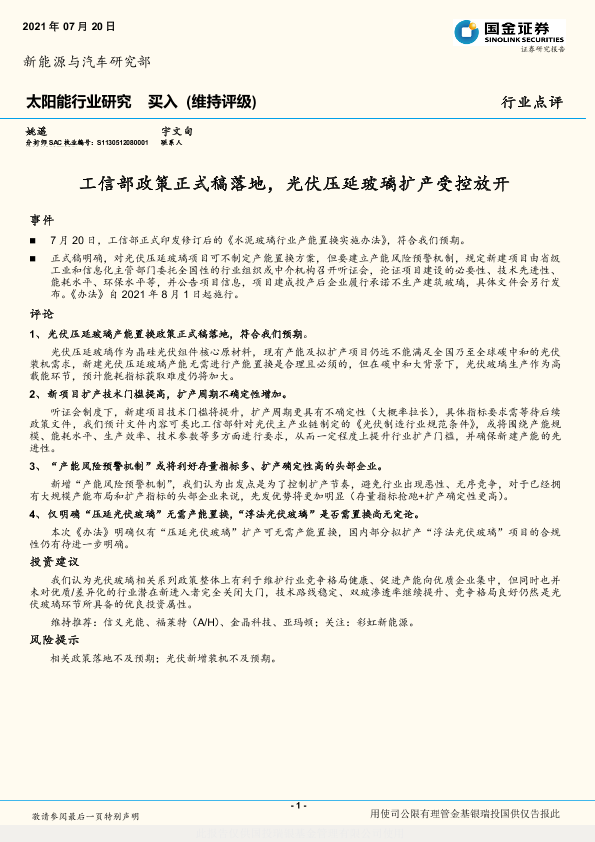 【国金证券】【20210720】太阳能行业研究:工信部政策正式稿落地,光伏压延玻璃扩产受控放开-3页